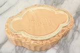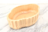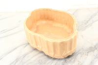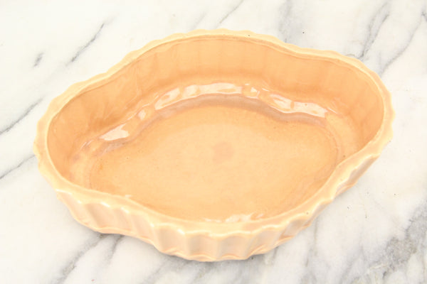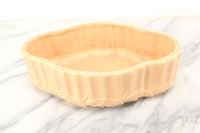 Here is a very nice pottery planter or dish made my McCoy Pottery in the USA. The base is surrounded by leaves and it has a ridged design around the perimeter. It is a peach-like orange color. This dish is in good condition but could use a thorough cleaning.
