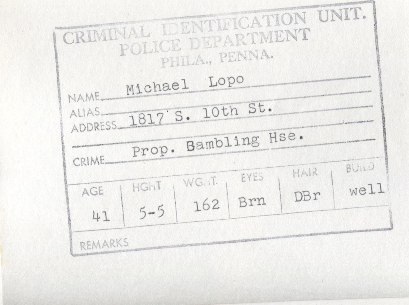Michael Lopo Mugshot - Arrested on 3/1/1962 for Being a Gambling House Proprietor