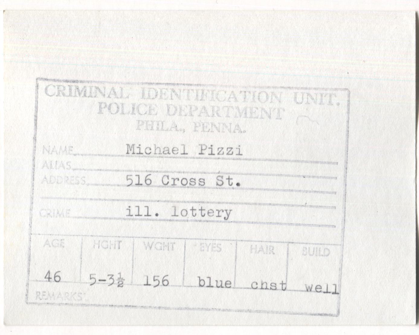 Michael Pizzi Mugshot - Arrested on 10/30/1959 for Illegal Lottery
