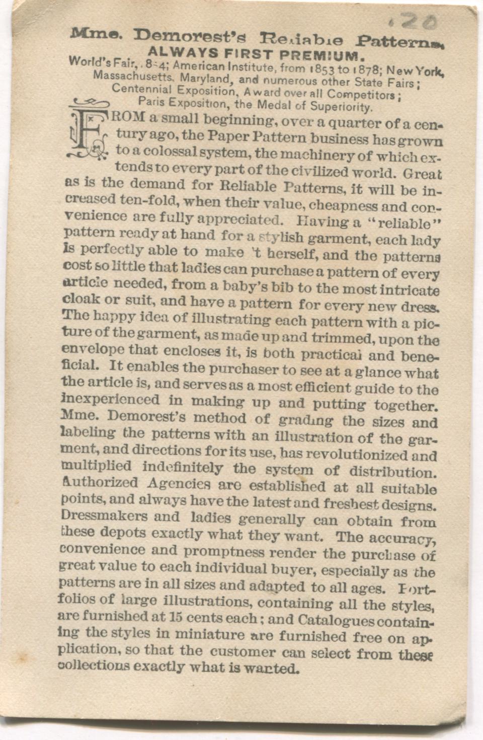 Mme. Demorest's Reliable Patterns Antique Trade Card - 3" x 4.75"