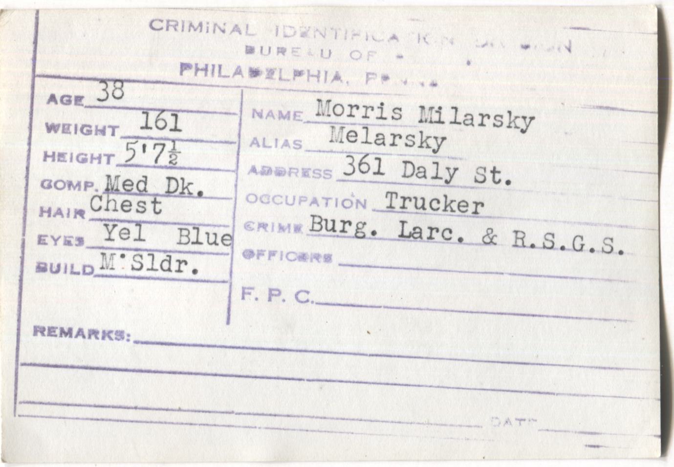 Morris Milarsky Mugshot - Arrested on 1/3/1946 for Burglary & Larceny