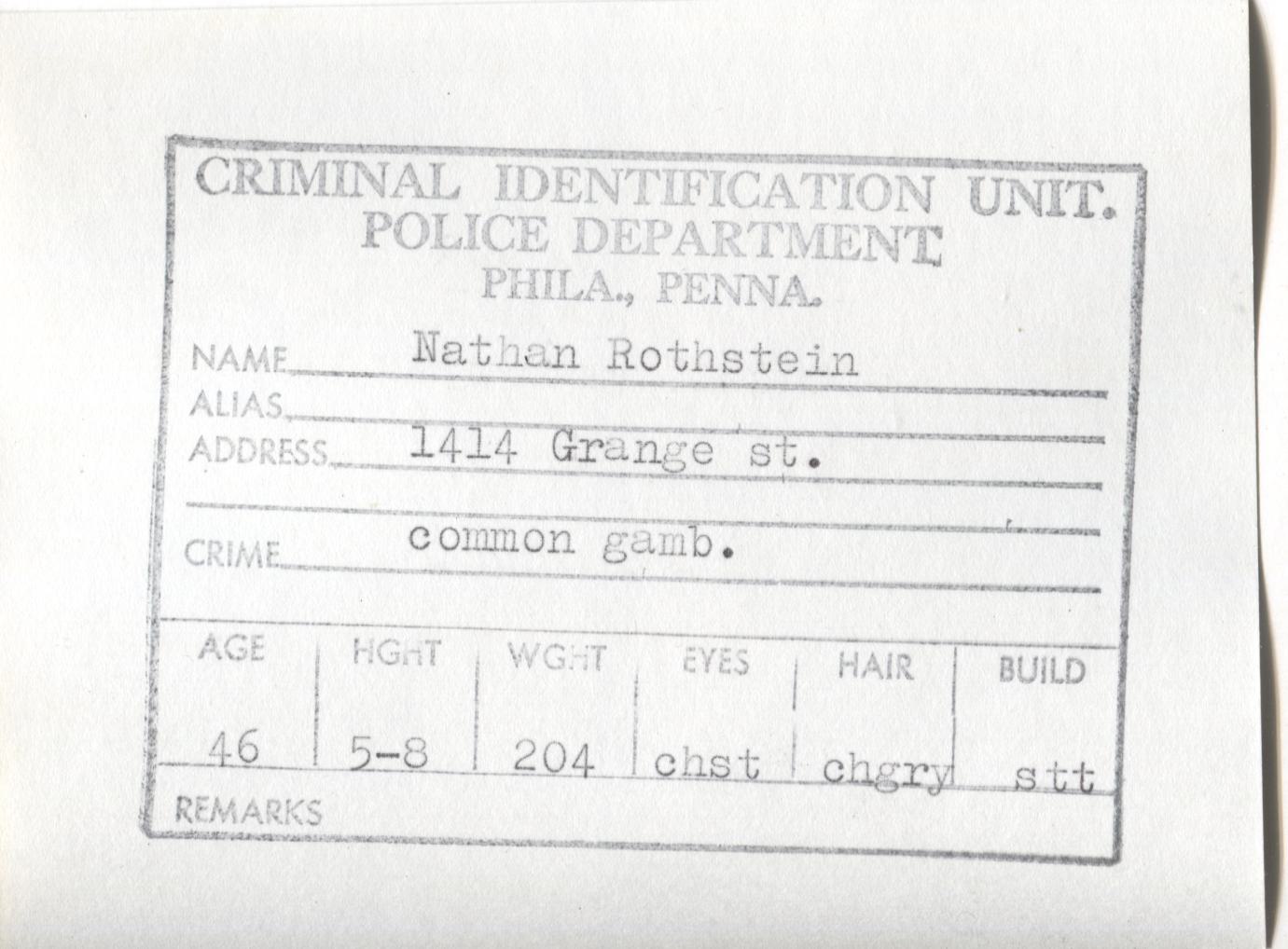 Nathan Rothstein Mugshot - Arrested on 1/12/1960 for Being a Common Gambler