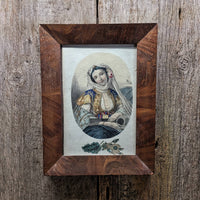 Here's a truly stunning genuine antique print of a beautiful woman with a mandolin, likely Italian in origin. It includes some printed flowers that someone decoupaged on the bottom of the print. The print itself has an interesting crackled texture to it, maybe from age or the printing process, but I think it gives it a cool look. Lovely antique frame with real wood patterning. About 12.5 x 16.5"! Yours for $52 shipped!