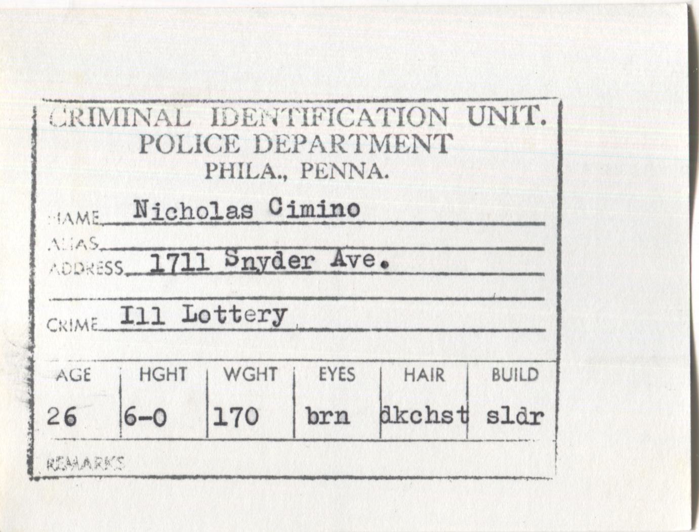 Nicholas Cimino Mugshot - Arrested on 2/21/1960 for Illegal Lottery
