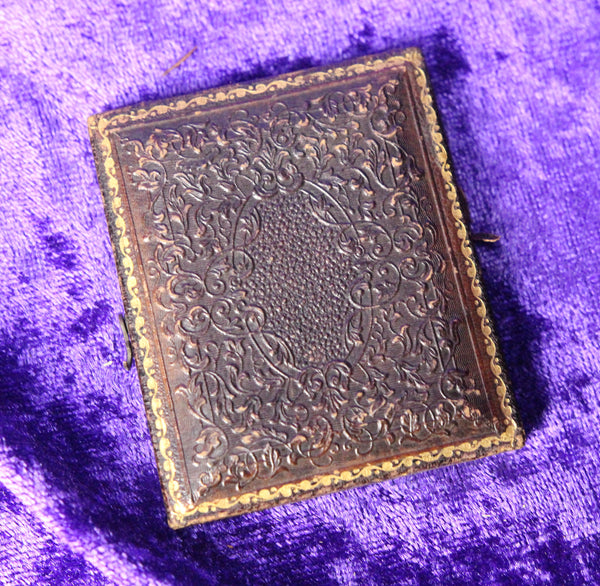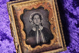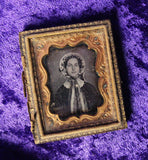 Here is a ninth plate (approximately 2" x 2.5") daguerreotype photograph from the mid-1800s in a half union case that measures 3" x 2.25". This astonishingly clear photograph depicts a very beautiful young woman wearing a flower bonnet.
