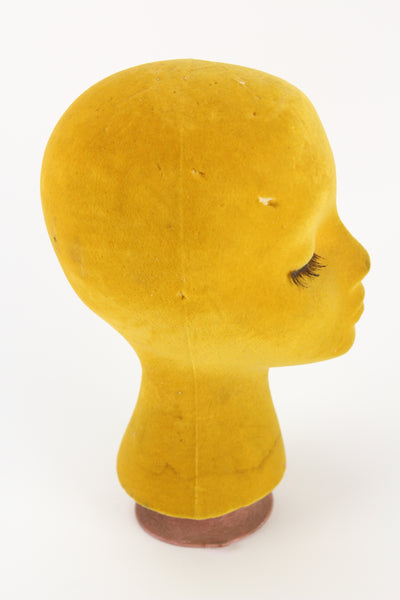 Here is a great vintage mannequin head hat display by Norman Kartiganer Inc out of Worcester, Massachusetts. The head features applied eyelashes and a posh expression. The head has some dings and nicks in the felt and styrofoam, which I will try to accurately represent in the pictures. It sits on a pink rubber suction cup stand. There is some water staining on the neck.