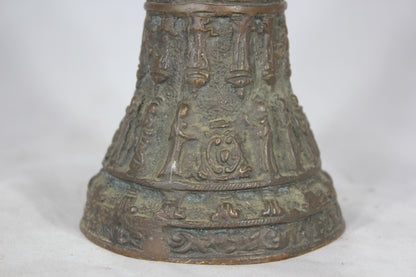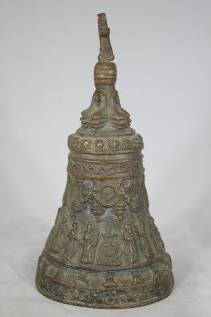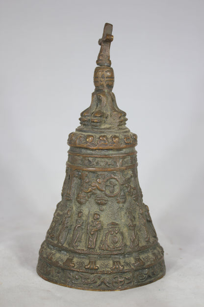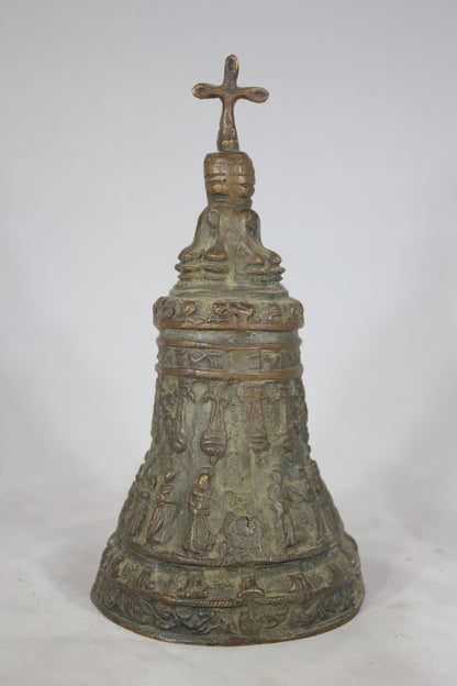 This heavy metal bell has a stunning patina and shows its age in the most beautiful way. It features a cross at the very top, and is adorned throughout with ornate imagery, including men (possibly saints or apostles) and other creative designs. The bell rings loudly when you give it a good shake and is complete. A great item for the collector of religious relics, or maybe you're a bell collector! Either way, this thing is a beauty.