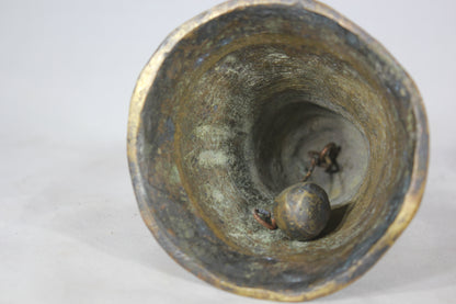 This bell is in good condition with no cracks or breaks. There is a heavy patina throughout that adds to its immense character. The opening of the bell is slightly misshaped from age and use.