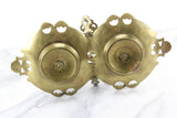 Here is a very nice antique brass double inkwell with a handle, two hinged covers, and ornate details throughout. It is in great condition with some wear and corrosion in the metal. The hinges in the inkwell caps operate smoothly.