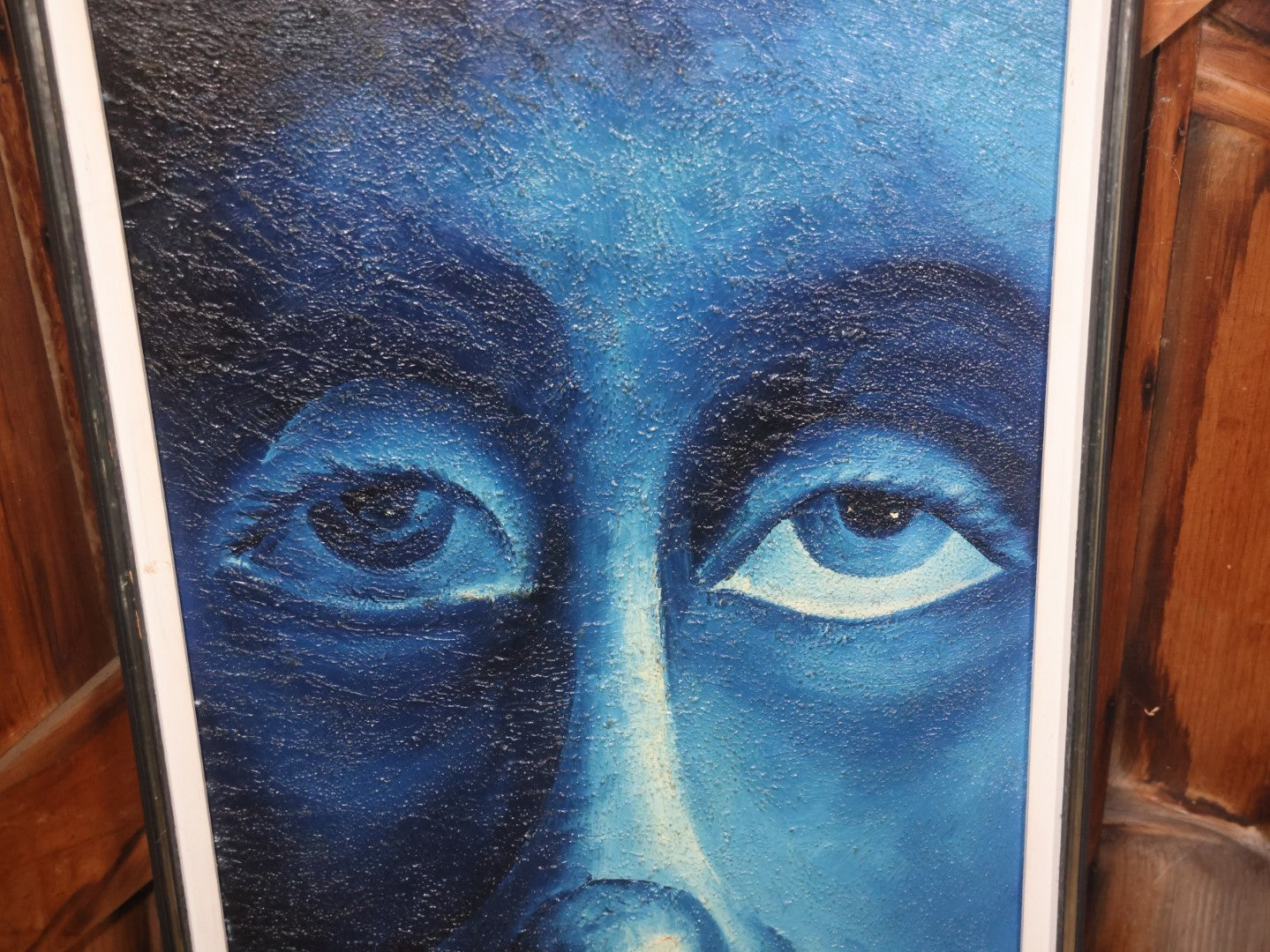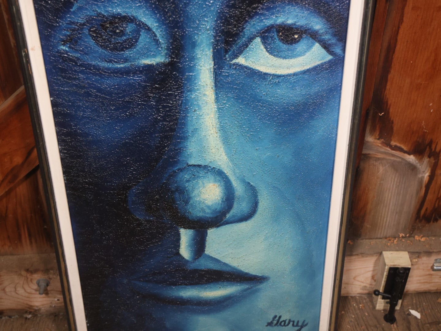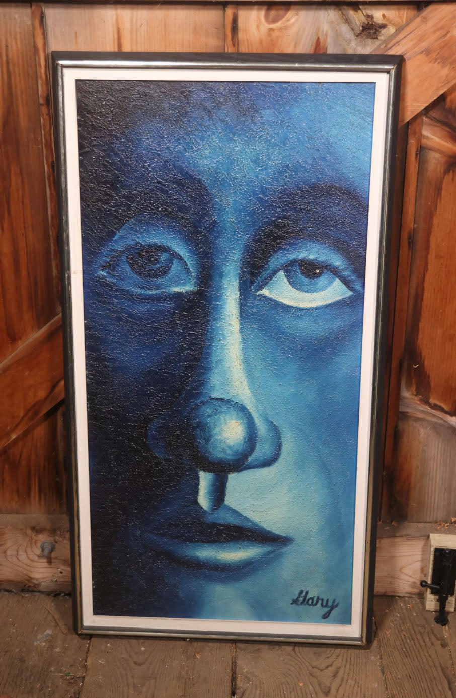 Oversized Vintage Oil On Board Painting Of A Blue Face, Signed Gary, In Frame