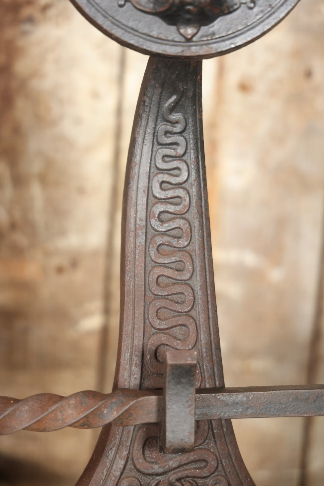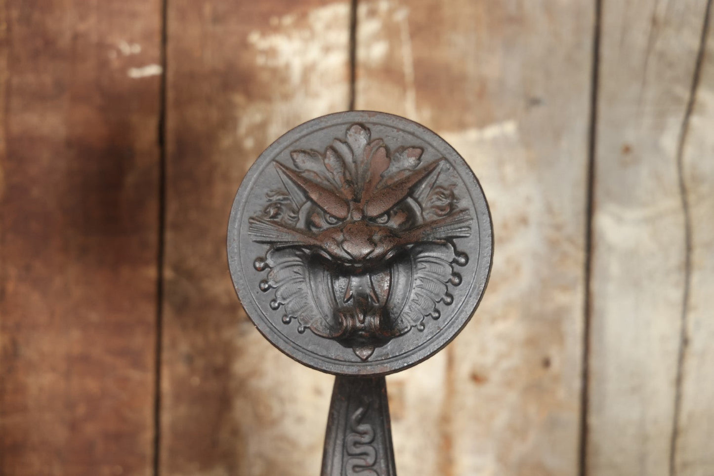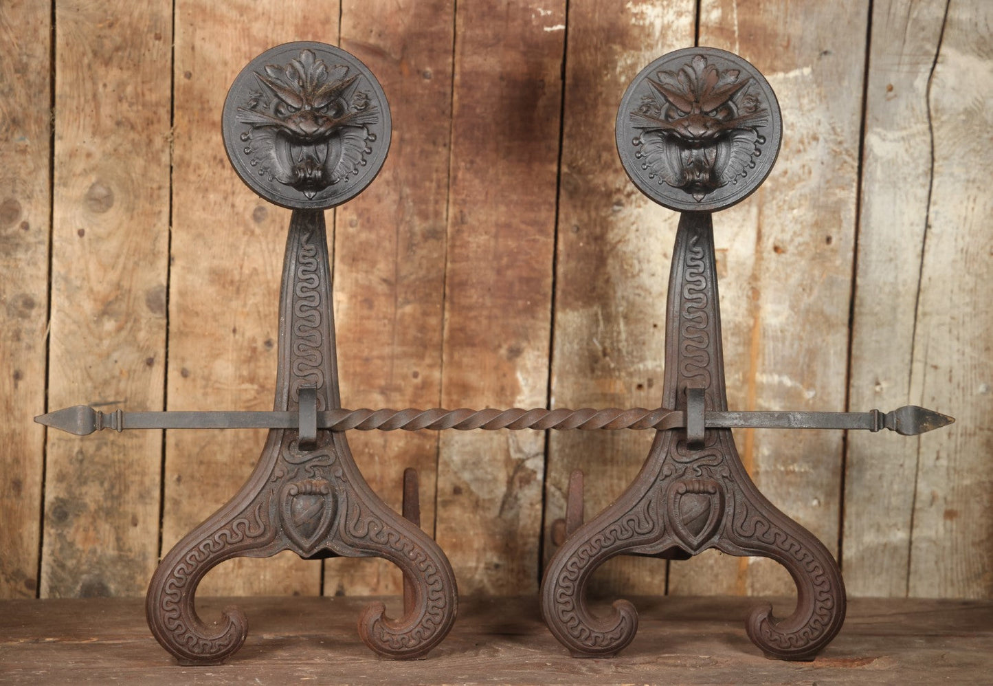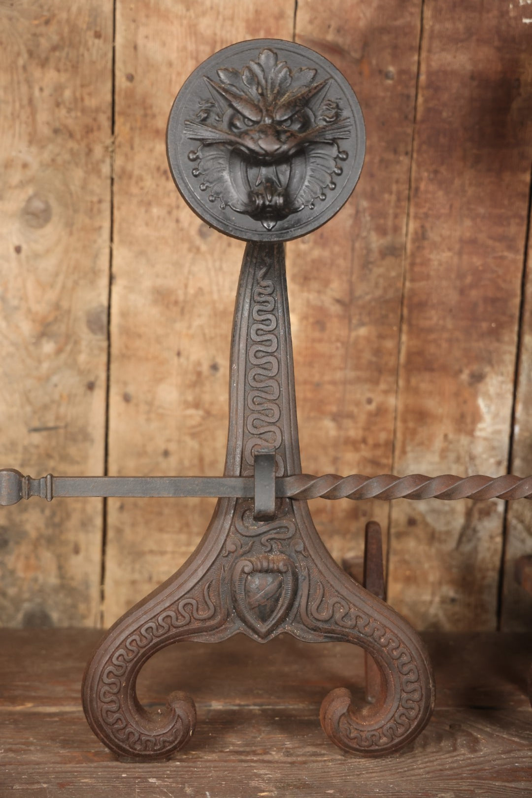 Pair Antique Cast Iron Bradley And Hubbard Dragon Face Andirons #9509 With Crossbar, Patented 1896