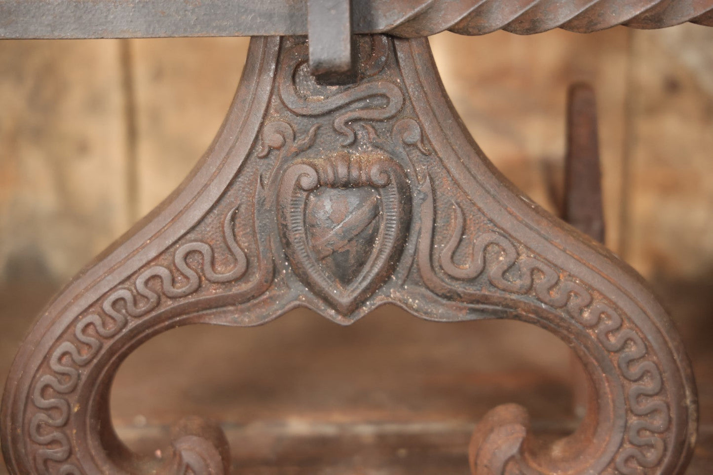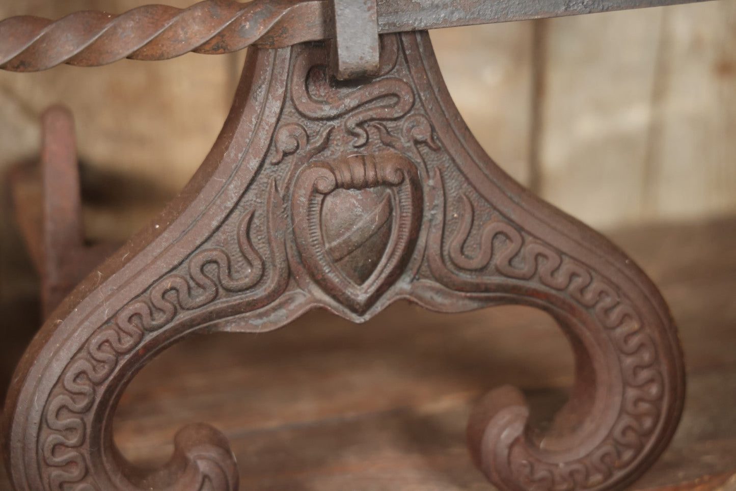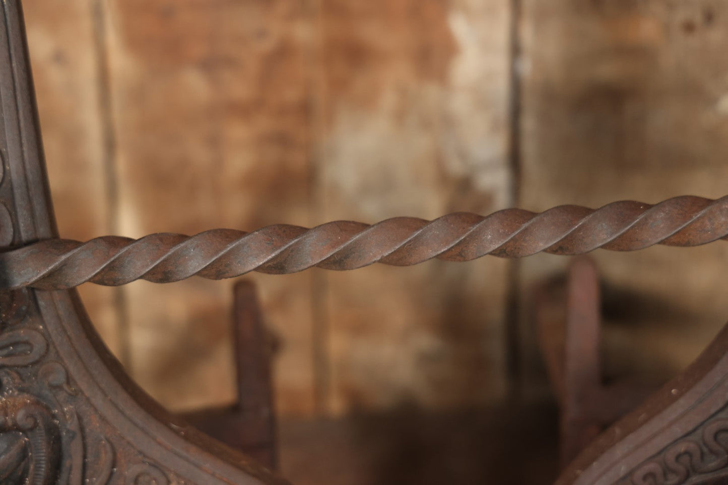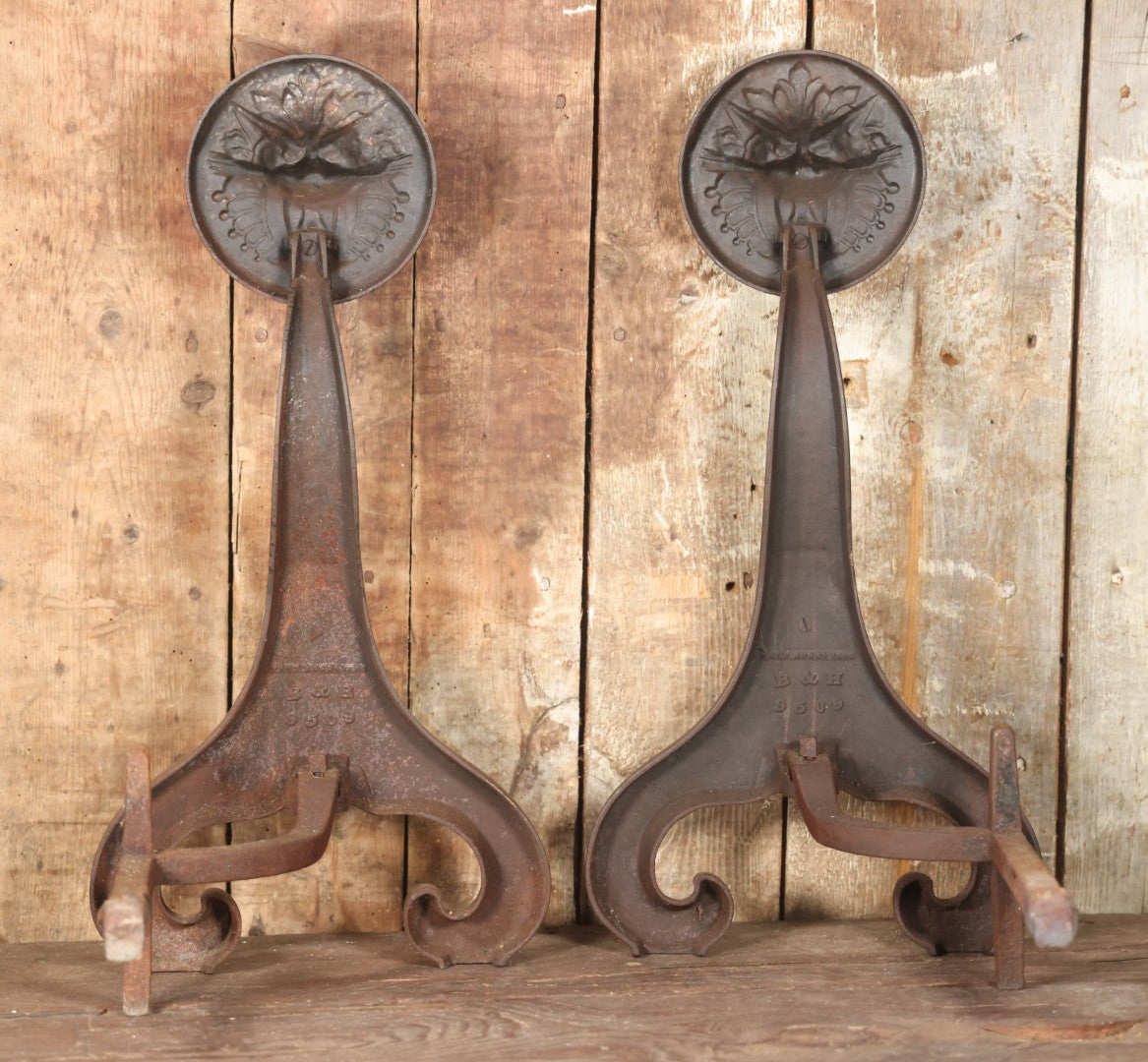 Various wear and rust, seized bolts. Dogs on andirons damaged and broken, but andirons stand freely and display well. Somewhat wobbly.