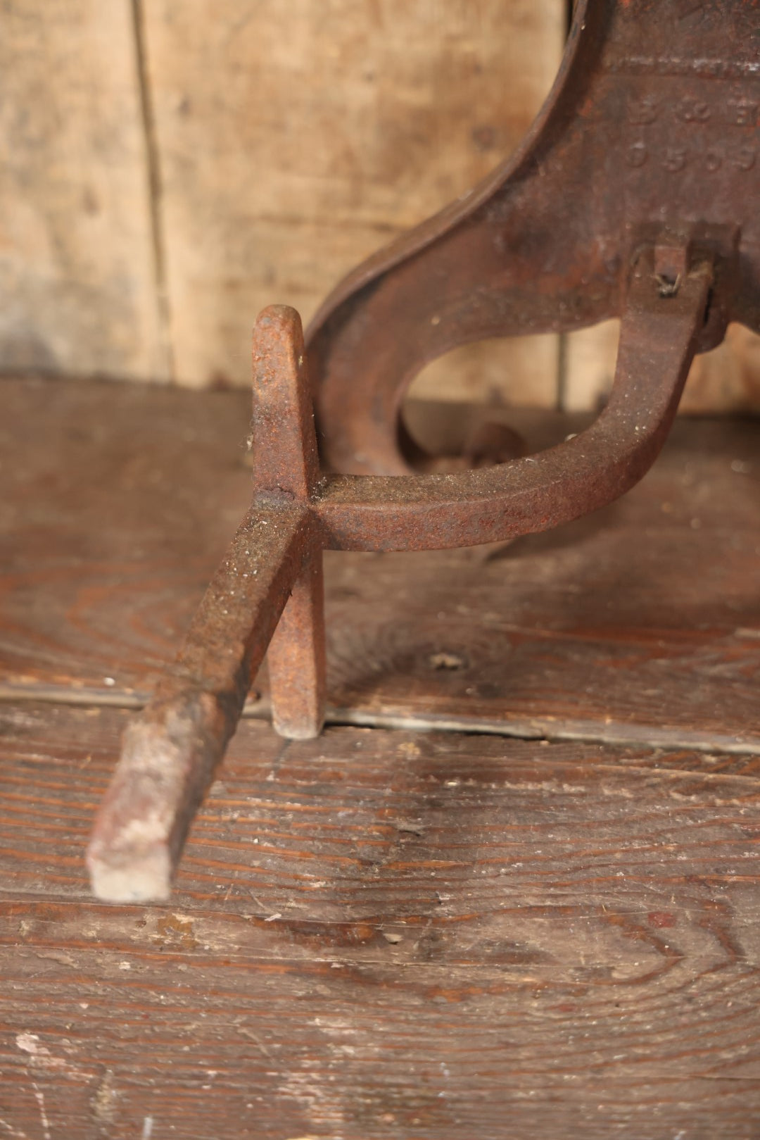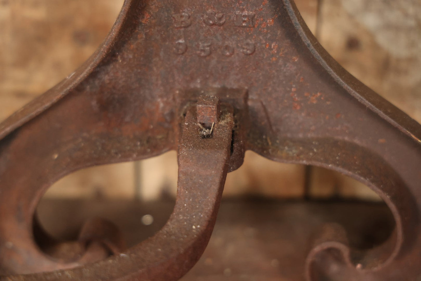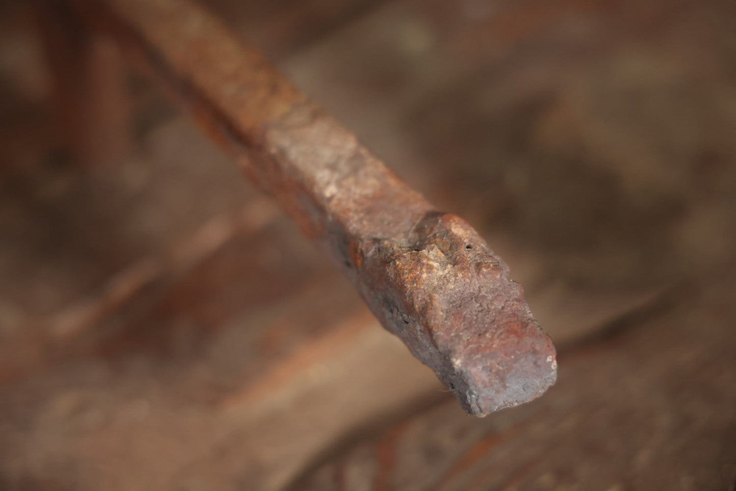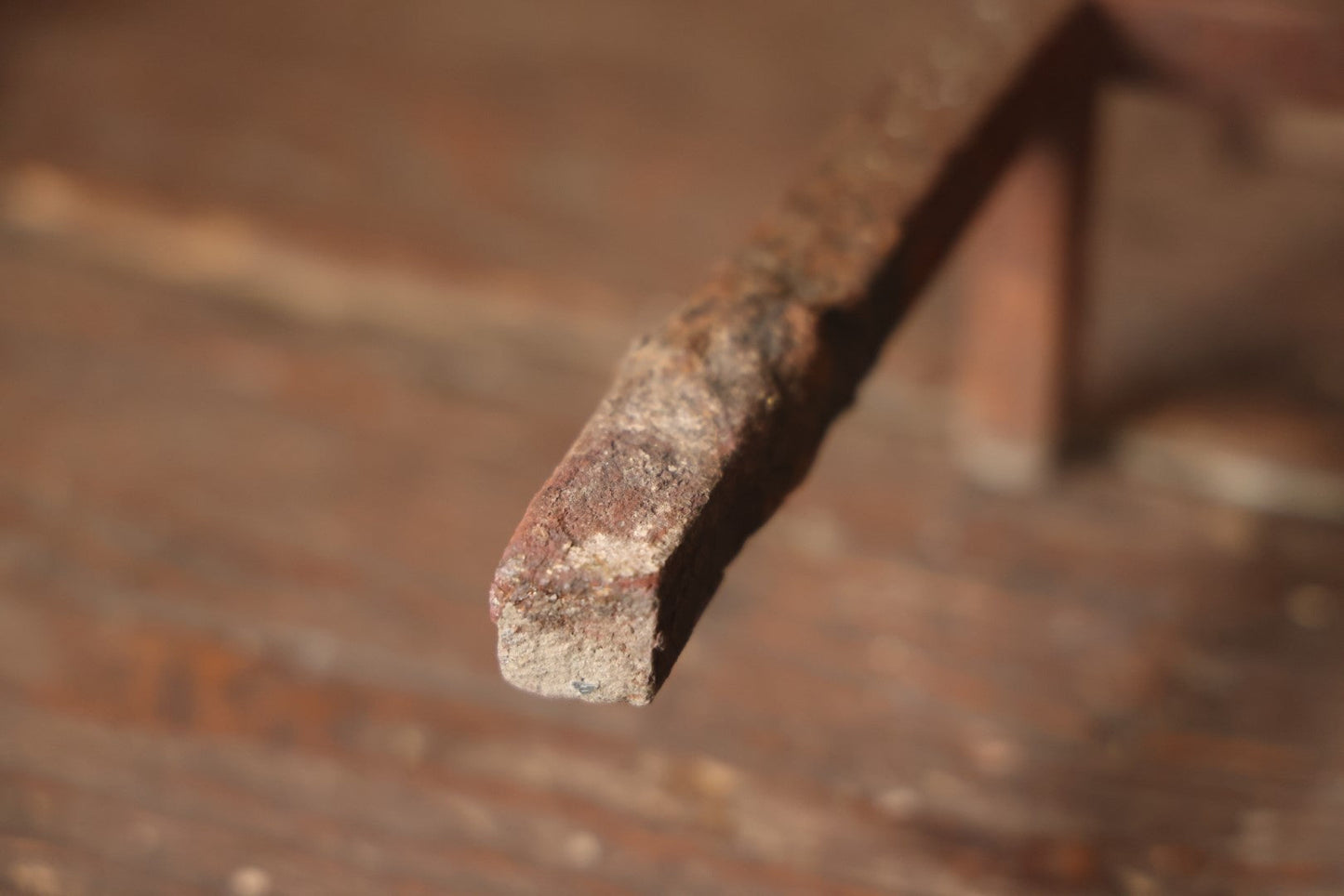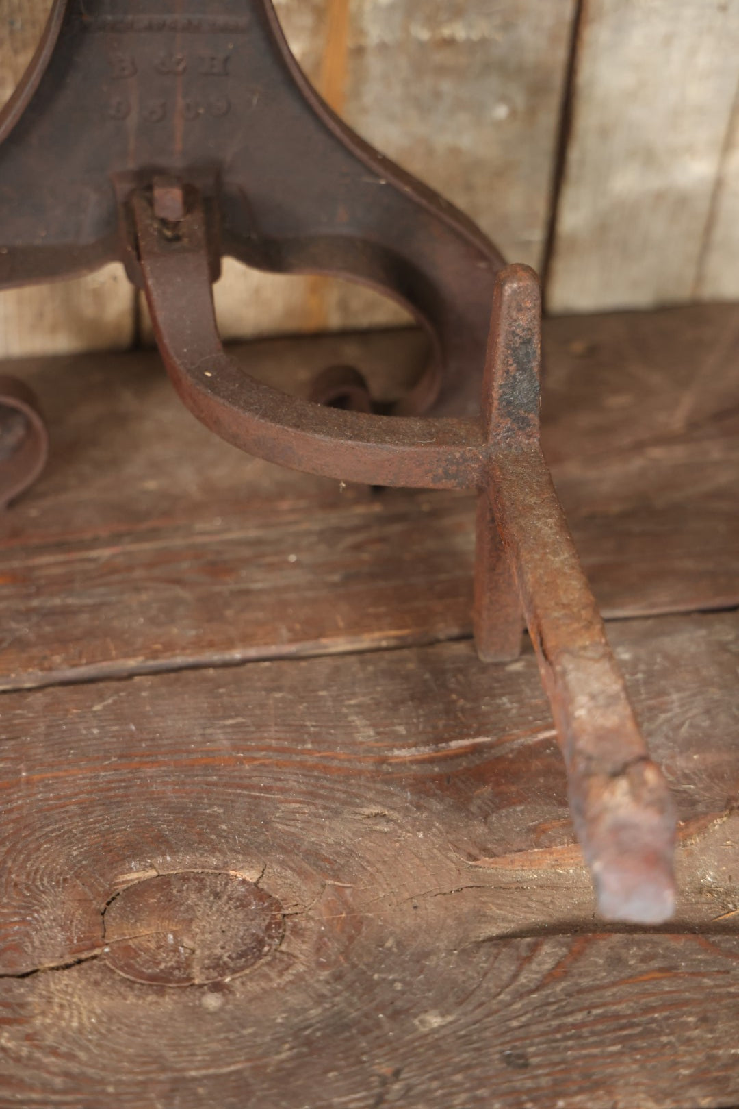 Various wear and rust, seized bolts. Dogs on andirons damaged and broken, but andirons stand freely and display well. Somewhat wobbly.