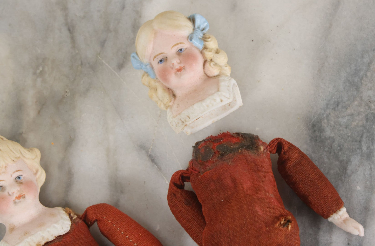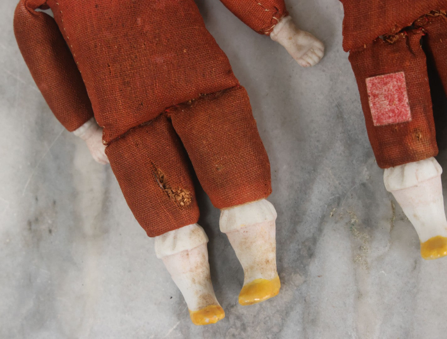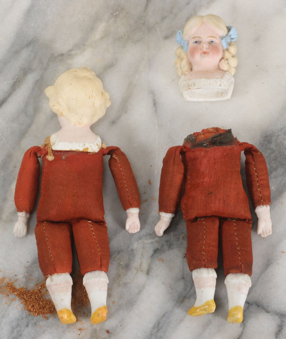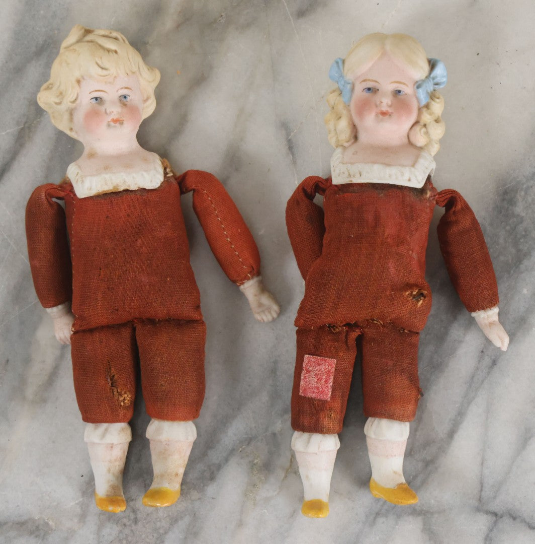 Lot 097 - Pair Of Antique Bisque Dolls With Boy And Girl With Blue Bows And Sawdust Filled Cloth Bodies, Note Girl's Head Detached, Holes In Bodies, With Sawdust Leakage, 6-1/4" Height Each