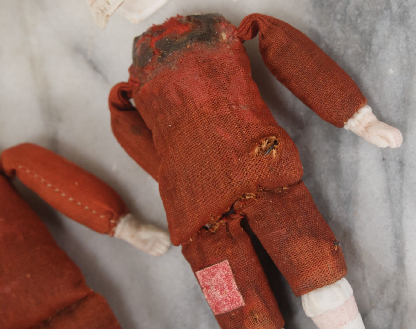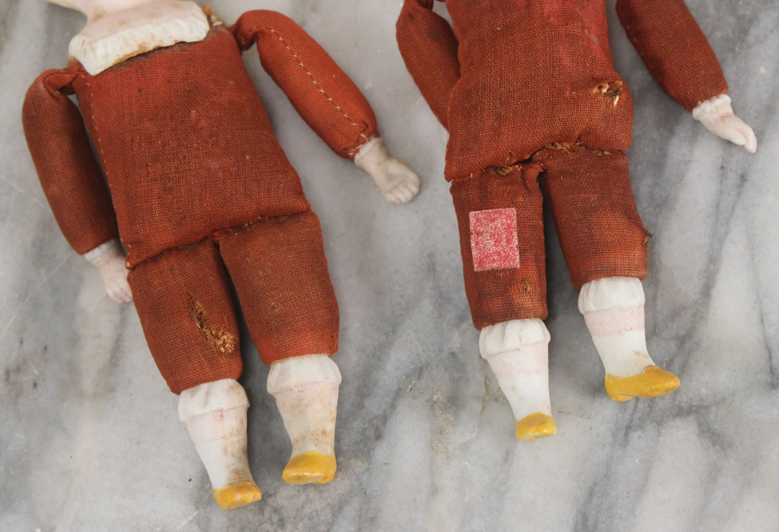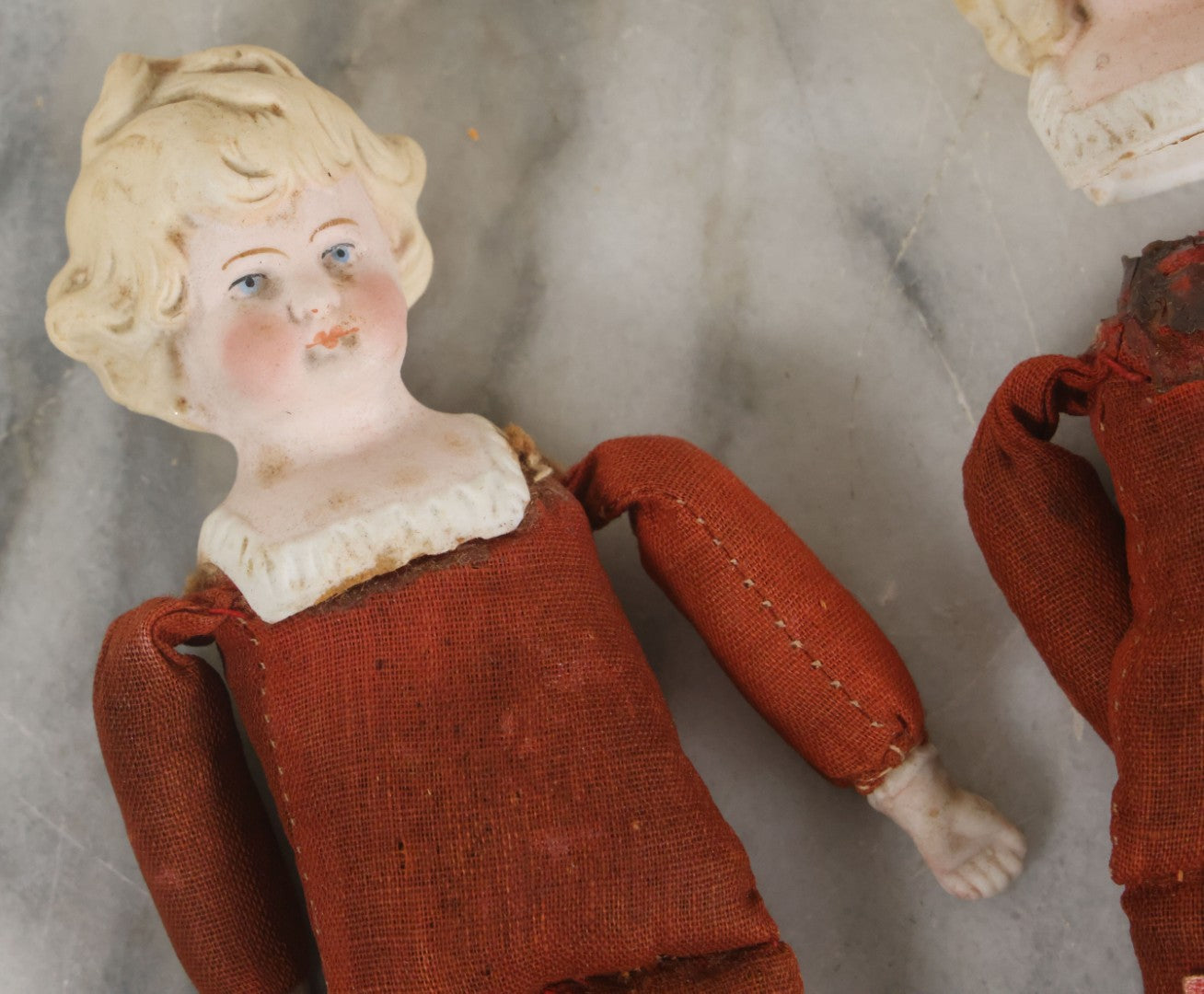 Lot 097 - Pair Of Antique Bisque Dolls With Boy And Girl With Blue Bows And Sawdust Filled Cloth Bodies, Note Girl's Head Detached, Holes In Bodies, With Sawdust Leakage, 6-1/4" Height Each
