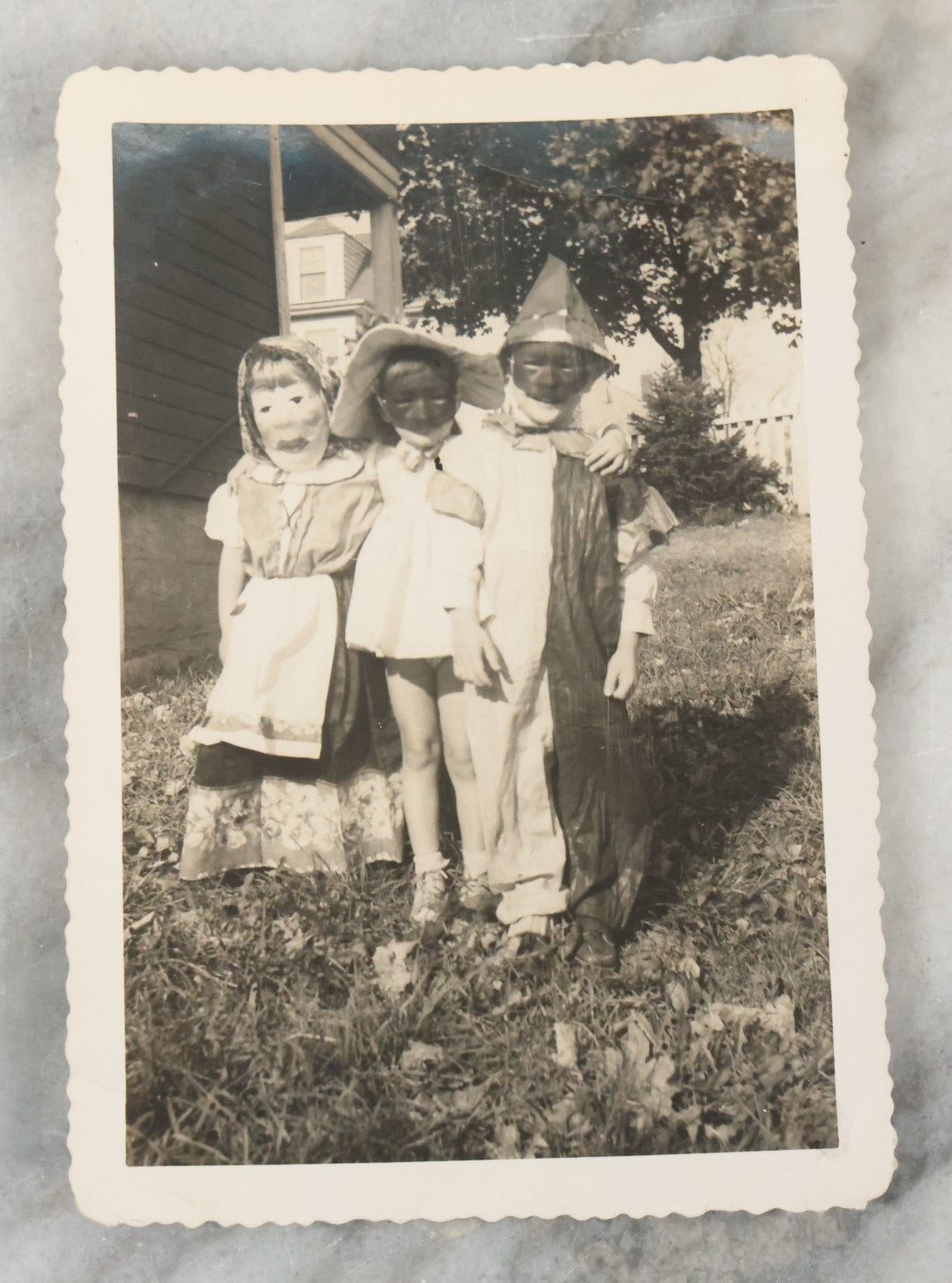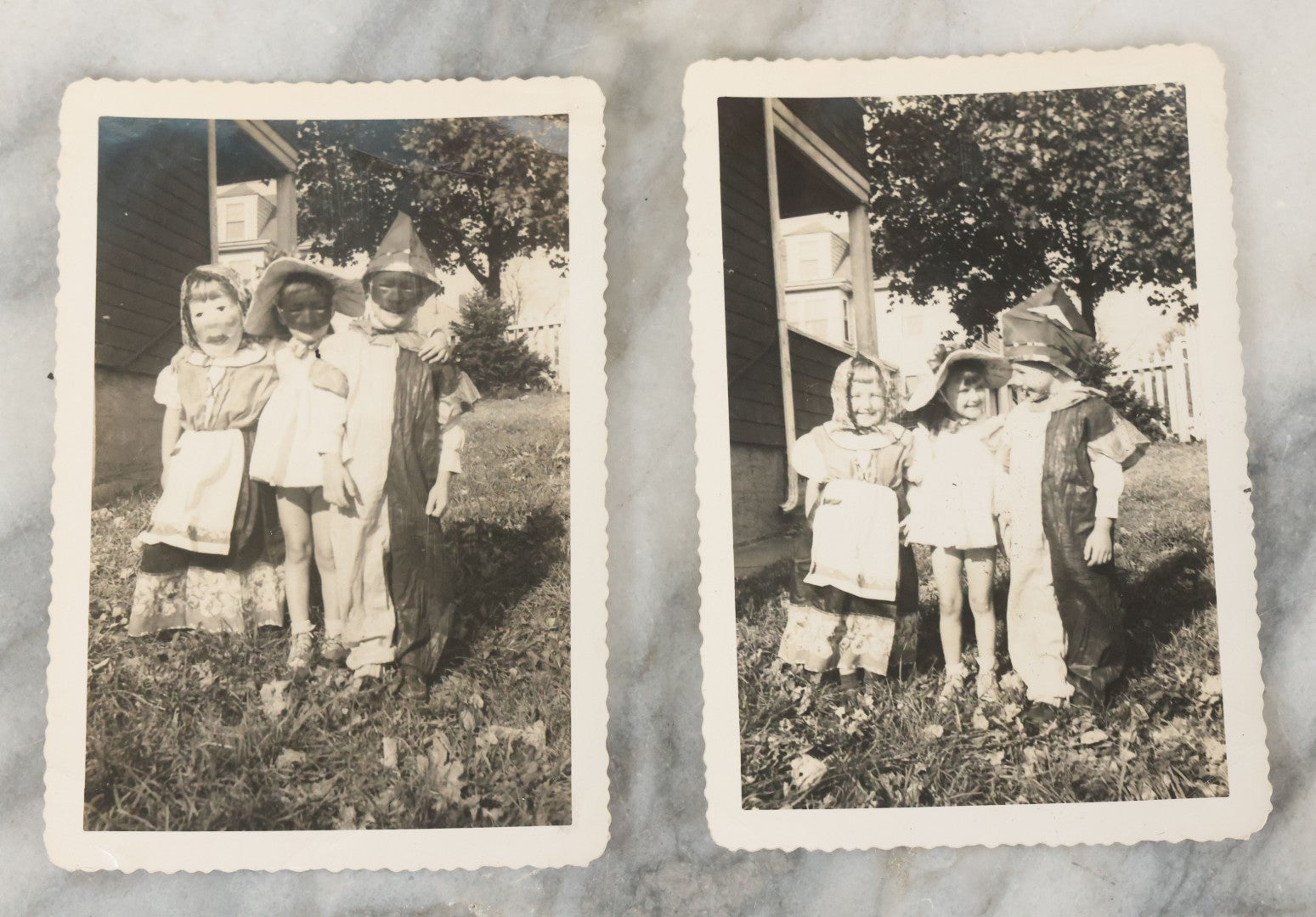 Lot 077 - Pair Of Vintage Snapshot Photographs Of 3 Children In Costume With Masks On Halloween, Circa 1944