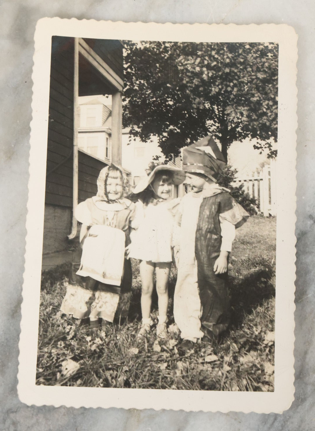 Your absentee bid for Lot 077 - Pair Of Vintage Snapshot Photographs Of 3 Children In Costume With Masks On Halloween, Circa 1944 was successfully submitted—thank you for bidding with us!