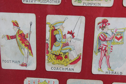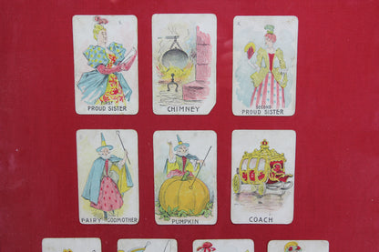 Here is a charming wall hanger display featuring 17 framed illustrated cards from the antique Parker Brothers' Cinderella card game. The cards feature characters such as Cinderella, the Prince, the Courtier, the Fairy Godmother, and many others. This display is in a contemporary frame that was professionally done by Fernwood Gallery in Norwell, Massachusetts. The frame measures 16 x 24.5"