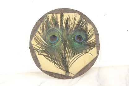 Here is a stunning vintage peacock feather with beautiful green and blue coloring that is encased in a glass frame with a canvas backing. The glass has some scratching but overall is in good condition. There is no hanger on the back of this piece, though one could be installed. As is it would need to sit flat on a desk or table or leaned up against a wall.
