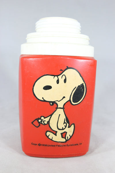 This great Peanuts metal lunchbox features all the favorite characters from Schulz's classic comic, including Snoopy, Charlie Brown, and more. This lunchbox includes a Snoopy thermos dated 1958, but please note that the cap and cup are missing. The lunchbox is in good shape with some dents and dings consistent with age. Both the lunchbox and thermos have a label with the previous owners' name on it that could be carefully removed.