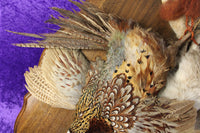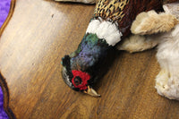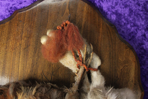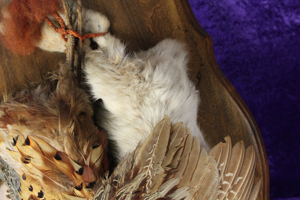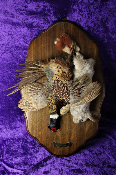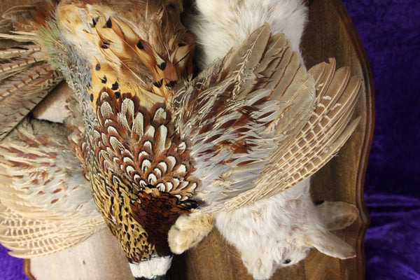Here is an incredible antique taxidermy mount featuring a pheasant and a rabbit strung up as they likely were after the original hunt. The lacquered wooden plaque features a smaller brass plaque on the bottom that reads "Day's Hunt." This very large taxidermy mount measures 18" x 33" and is in good condition.