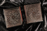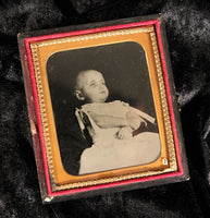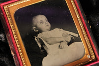 Here is a somber sixth plate tintype photograph of a deceased baby in a seated position with tied wrists so that the baby's hands do not fall off to the sides. This image comes in a separated but complete union case behind a brass mat and a glass panel. The picture is a sixth plate tintype, its dimensions being approximately 2.75" x 3.25," not including the case.