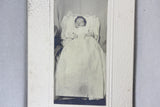 This antique postmortem photograph depicts a deceased baby of unknown gender in bereavement gowns. This photograph is mounted on a white matte and comes in a protective folder. There are some dirt stains on the matte in the upper left corner.