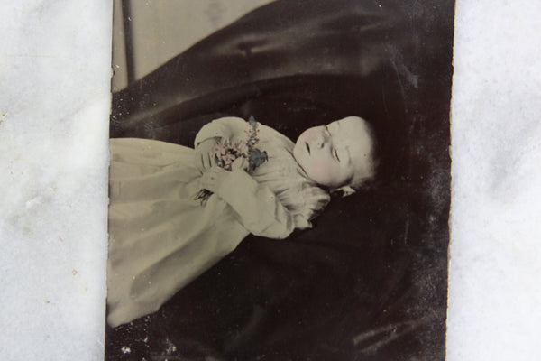 Postmortem Tintype Photograph of a Baby with Flowers in Repose