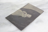 This antique postmortem photograph depicts a deceased baby of unknown gender laying in peaceful repose on black linens. The tintype photograph is in good condition with a slight dent in the right side.