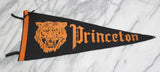 This vintage felt pennant is a souvenir of Princeton University and features the Tiger mascot of the Princeton Tigers Football team. The pennant is in good condition with some wear consistent with age, including pinholes where pushpins once were, and some damage to the very tip of the flag. The pennant measures 11" x 27"