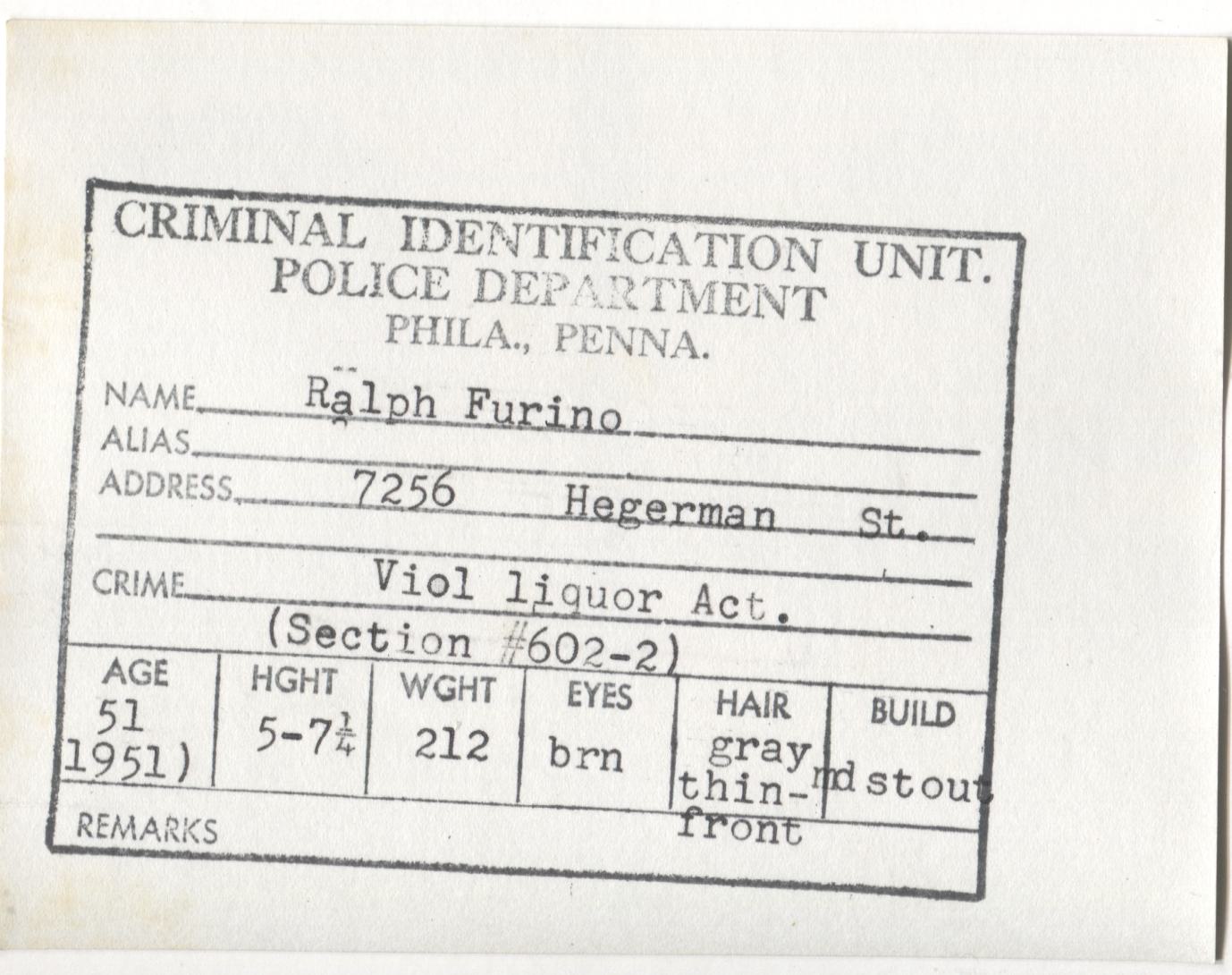 Ralph Furino Mugshot - Arrested on 6/1/1961 for Violating the Liquor Act