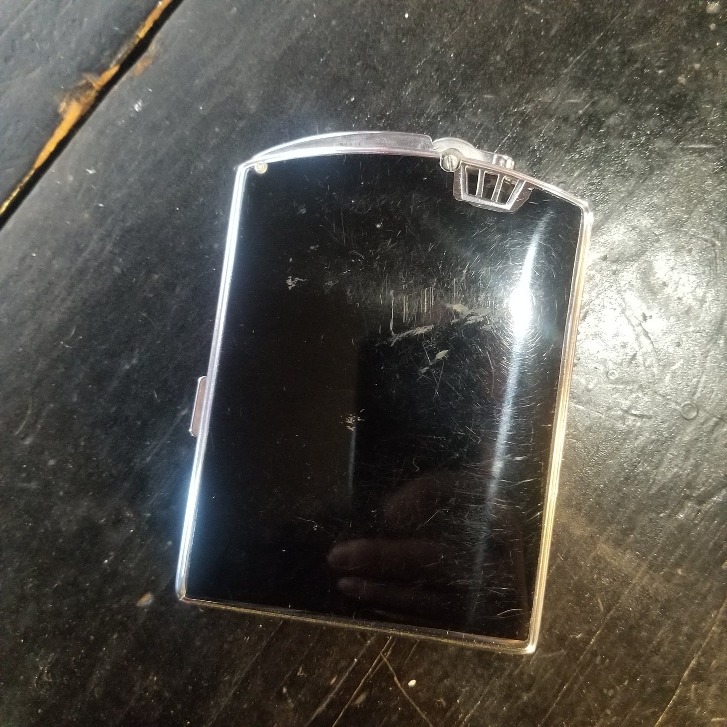 Spring loaded opening, new flint freshly installed and working great, needs fuel. Signs of wear and use on outside of the case. Metal and enamel construction. Art Deco design.
