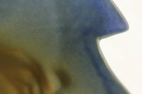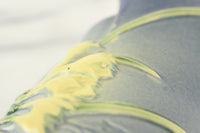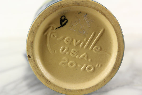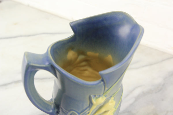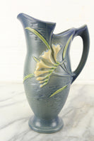 Here is a lovely vintage Roseville Pottery U.S.A. model number 20-10 art pottery ewer or pitcher style vase. It features a raised and nicely painted freesia motif. This vase is a beautiful blue color. The vase is in good condition with normal crazing typical of vintage pottery. There is a hairline crack on the inside to of the pitcher and two very small chips, likely manufacturing imperfections, on the outside. I will post pictures of both so you have a complete understanding of this item's condition.