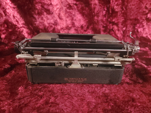 Here is a wonderful Royal Varsity UB Model manual portable typewriter in its original case and in fully functioning condition with a brand new red and black ink ribbon installed and ready to be used. This machine shows normal signs of wear and tear to be expected from a vintage typewriter including minor rust spots, some spots of discoloration and chipping on the paint, as well as some internal dust and residue. There is some yellowing to the top cover. This typewriter was made in the USA.
