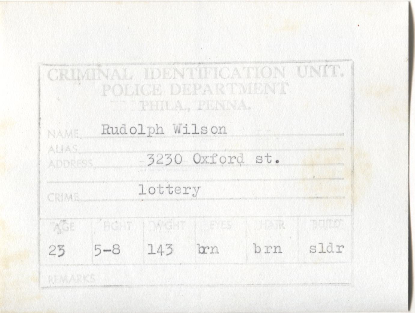 Rudolph Wilson Mugshot - Arrested on 6/12/1961 for Illegal Lottery