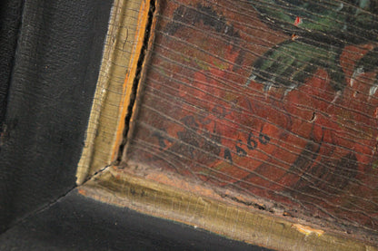 Here is an antique Christian icon featuring Saint George's legendary slaying of the dragon. The painting is on wood board and framed in a heavy wood framed. It is signed in the lower left corner and dated 1866. Please note that there are losses to the paint about the center of the painting, which you can view in photographs.