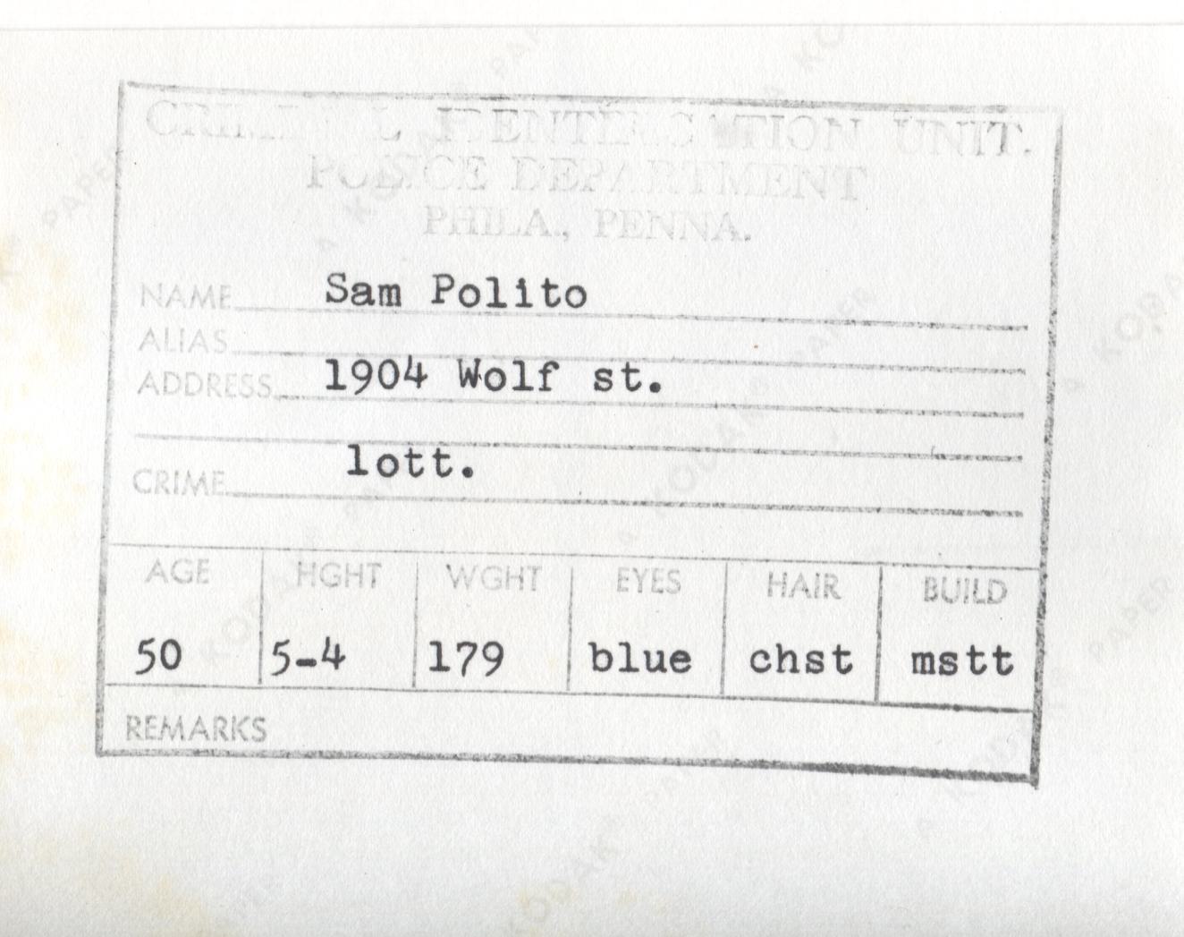 Sam Polito Mugshot - Arrested on 4/15/1964 for Illegal Lottery