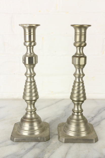 Here is an awesome pair of vintage silver-toned solid brass candlesticks that were made in the United States, and are so marked on the bottom. These candlesticks stand just shy of 10" tall and are in nice condition with good patina throughout and general signs of wear. The candlesticks have some wax residue, which the buyer may choose to remove.