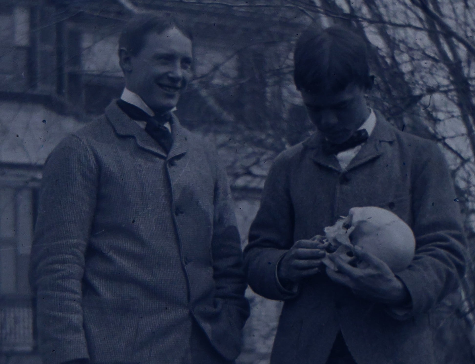 Lot 061 - Single Antique Glass Negative Plate, Man Holding Real Human Skull, With Grinning Man To Left, In Front Of House, Note Edge Cracks (First Photo Is Inverted)