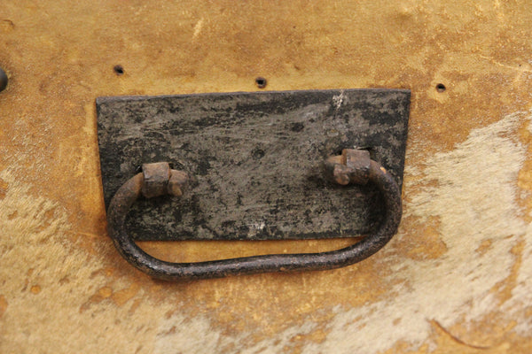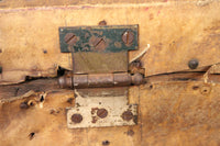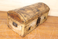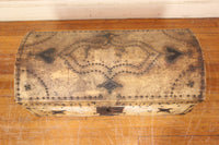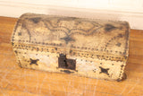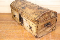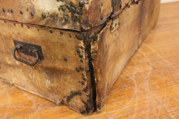 Here is a charming antique wooden trunk or chest completely covered in what is likely cow hide and decorated with metal studs. This distinctive looking chest would make a great decor item for any room, and offers ample storage. It is considerably worn throughout, given its considerable age, and may be a great candidate for restoration. It features antique metal hardware and hinges. Please see the photographs for some examples of the imperfections, which includes peeling hide, worn wood, and some rust. It is likely that the studs on the very top of the trunk once spelled out the initials of the original owner, but those and some other studs are missing