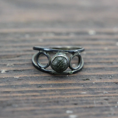 Here is a lovely size 7.5 sterling silver ring with a circular greenish black stone with white speckling. The ring is in good condition and is marked 925 sterling and Taxco Mexico.