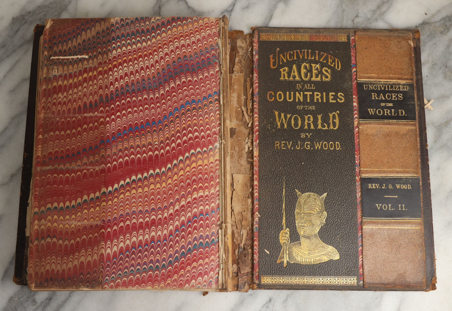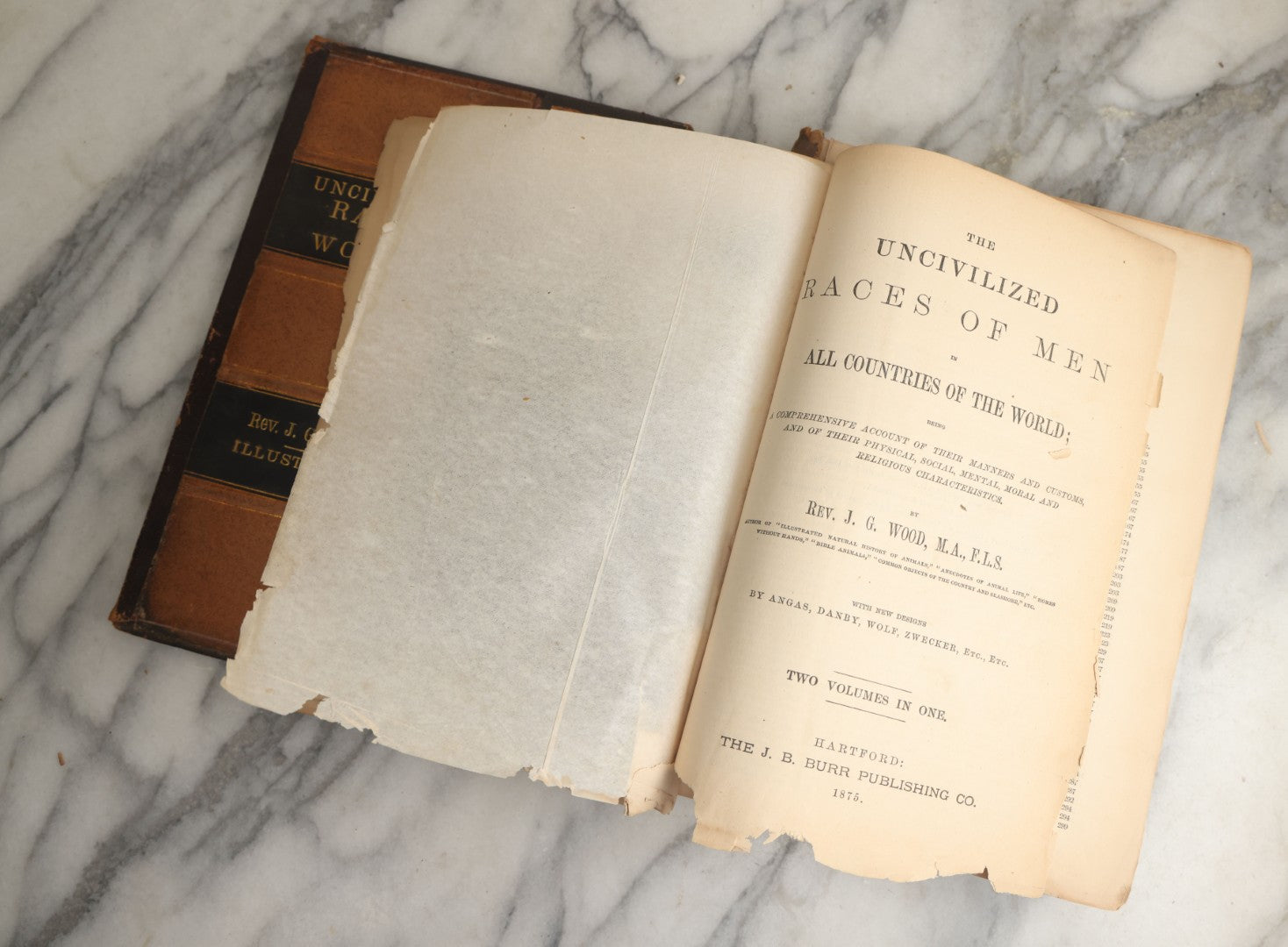Lot 079 - "The Uncivilized Races Of Men" Antique Dummy Salesman Sample Book By Reverend J.G. Wood, J.B. Burr And Company, Publishers, 1875, Hartford, Profusely Illustrated, Two Volumes In One, Note Poor Binding Condition