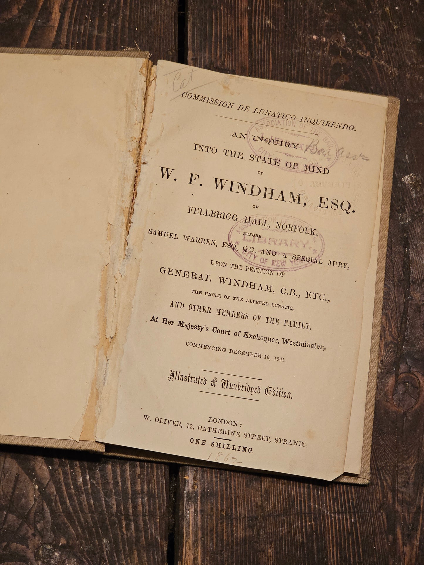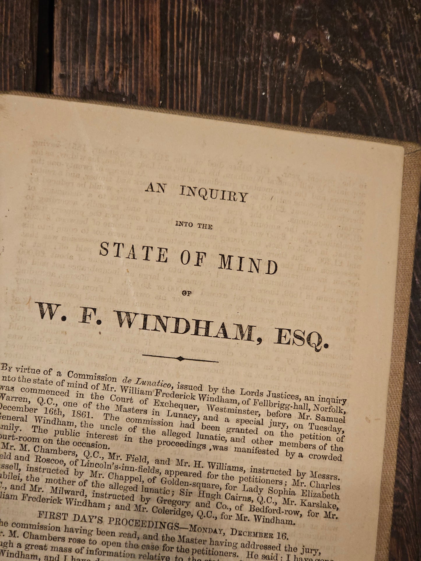 The Windham Lunacy Case, 1862 Book, An Inquiry Into the State of Mind of W.F. Windham, ESQ