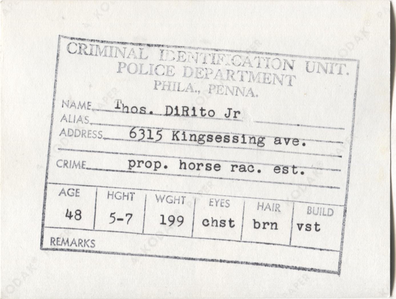 Thomas DiRito Jr. Mugshot - Arrested on 2/28/1964 for Being a Proprietor of a Horse Racing Establishment
