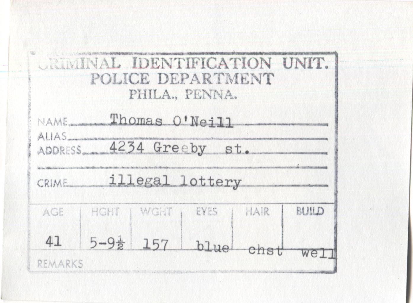 Thomas O'Neill Mugshot - Arrested on 1/9/1961 for Illegal Lottery