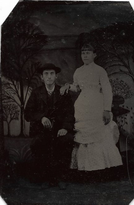 Tintype Photograph of a Man in a Hat Seated Beside a Woman in a White Dress