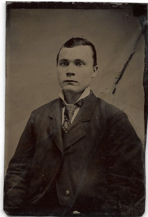 This tintype measures approximately 2.5 x 3.5 inches, plus or minus 1/2 inch.