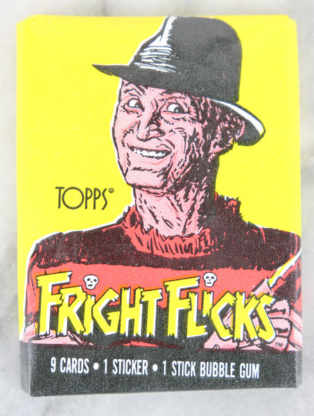 You're buying ONE sealed, unopened wax pack of vintage Topps Fright Flicks Trading Cards with the Freddy Krueger wrapper fresh from the box. The cards have photos from all the best 70s and 80s horror films like Alien, Nightmare on Elm Street, Day of the Dead, Fright Night and more! Each pack contains nine cards, one sticker, and one stick of gum.