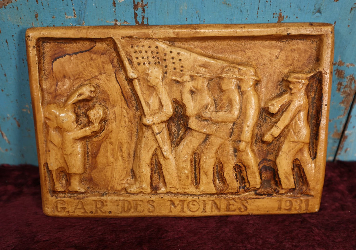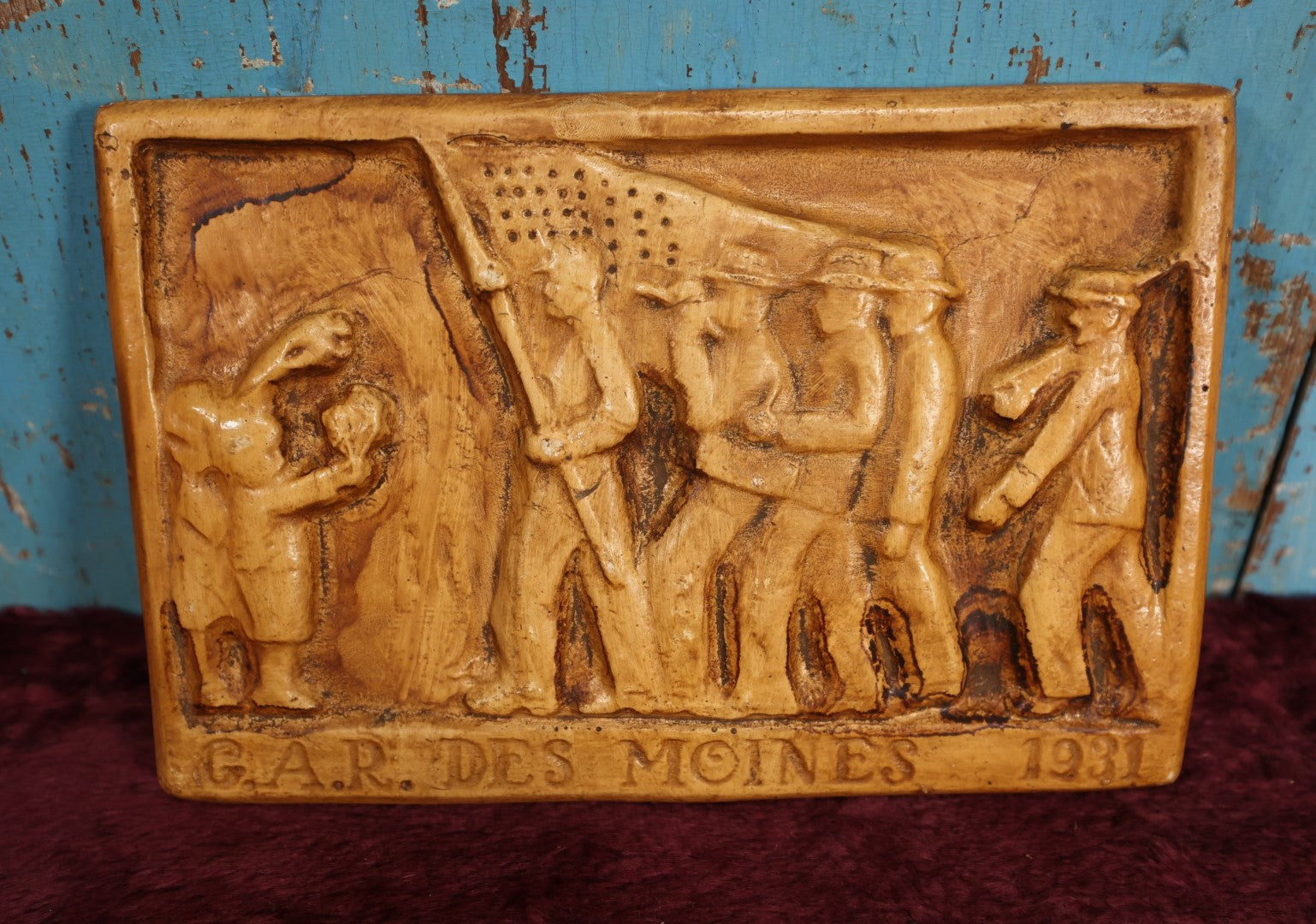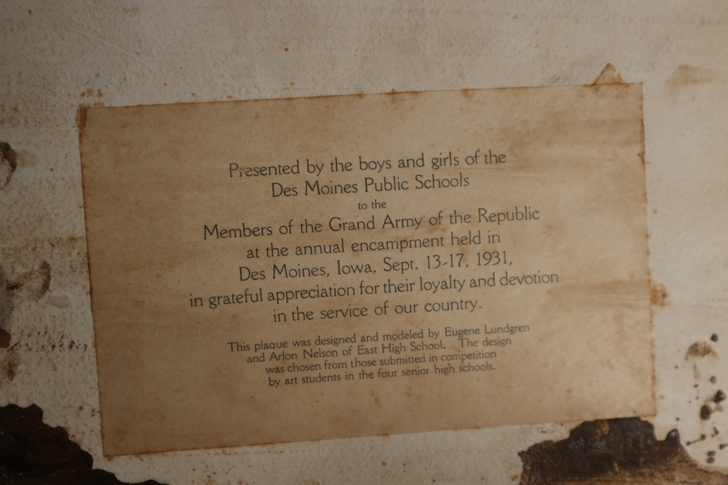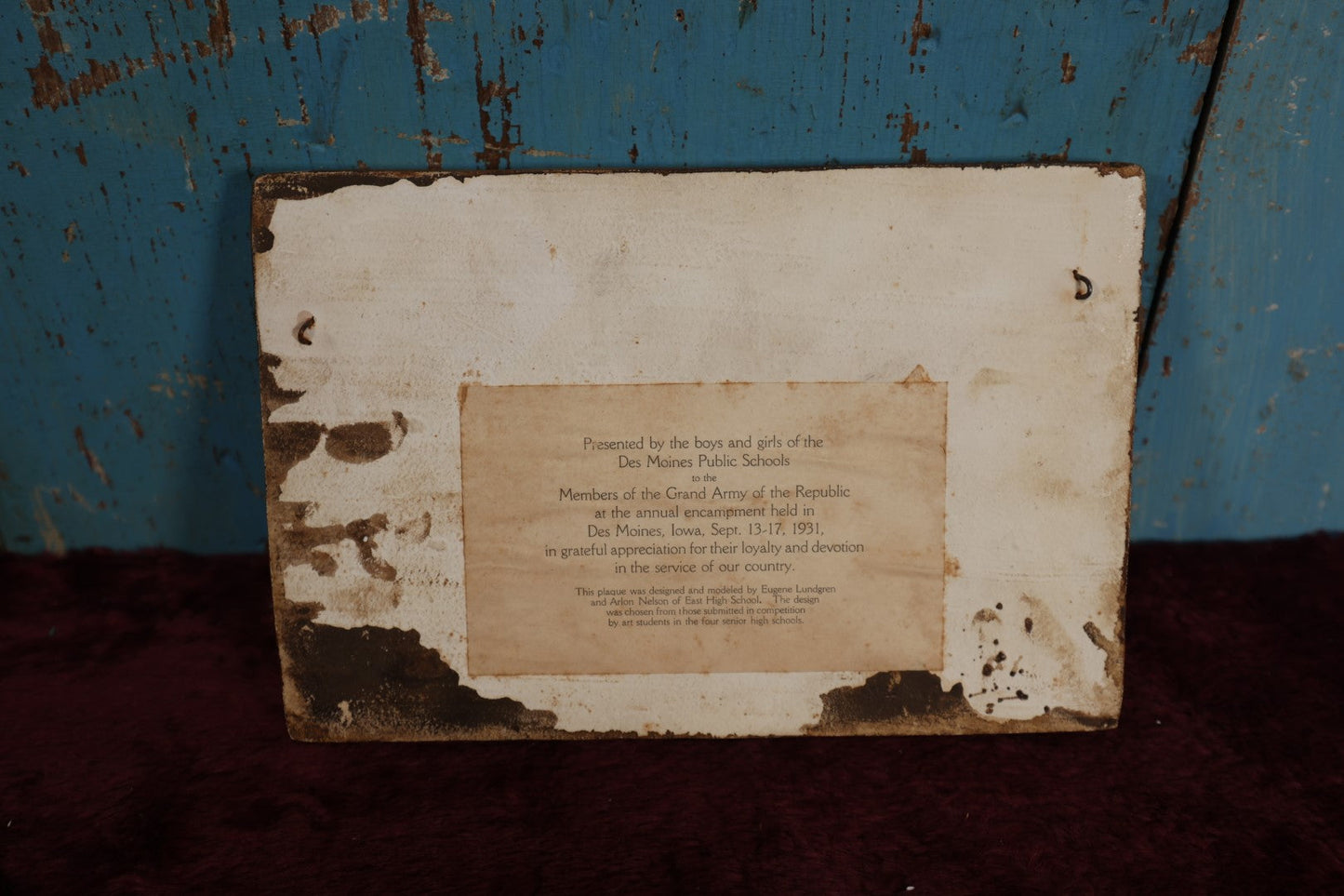 Lot 141 - Vintage Chalkware Plaque Presented In 1931 From The Des Moines School Children To Members of Post 53 G.A.R. Grand Army of The Republic Union Soldiers Fraternal Organization For Annual Encampment, Iowa, With Pamphlet