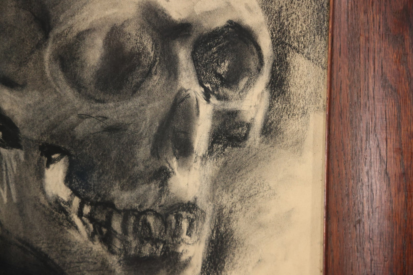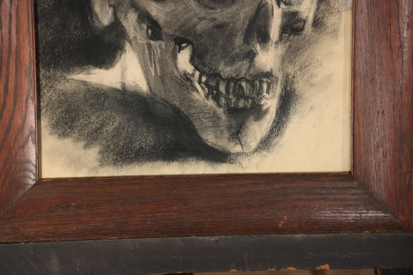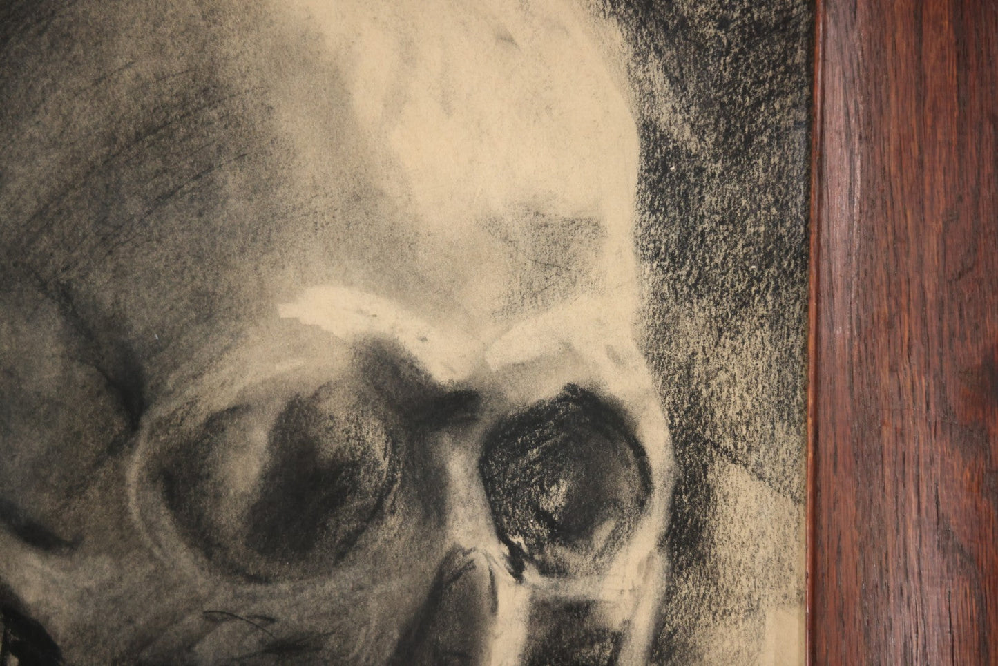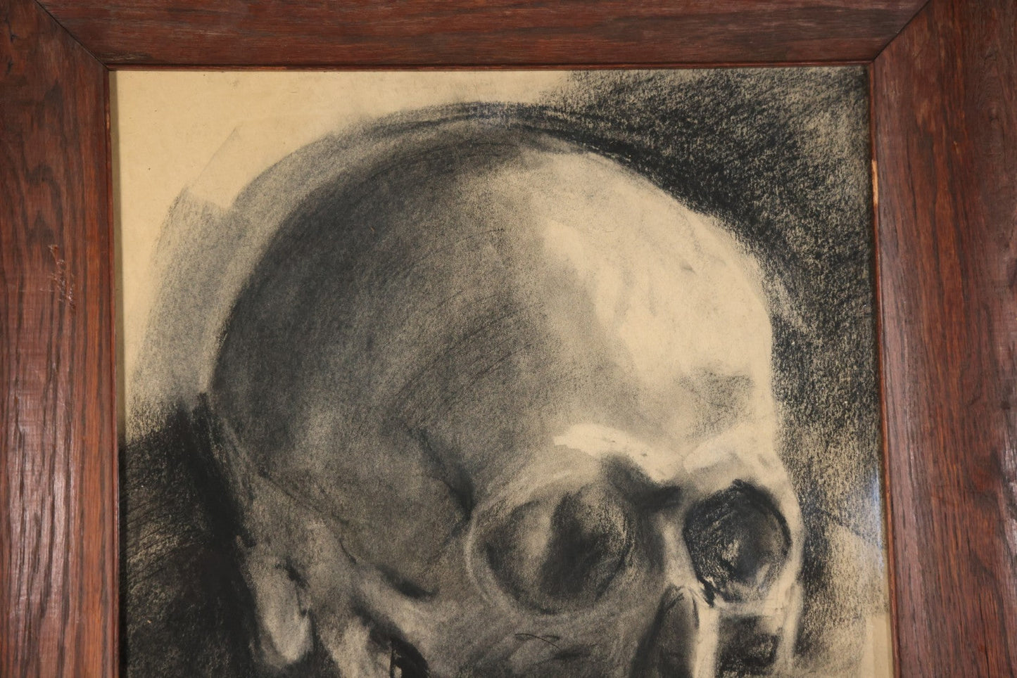 Vintage Charcoal Drawing Still Life Human Skull Study On Paper In Solid Wood Frame, 21-5/8" x 25-5/8"